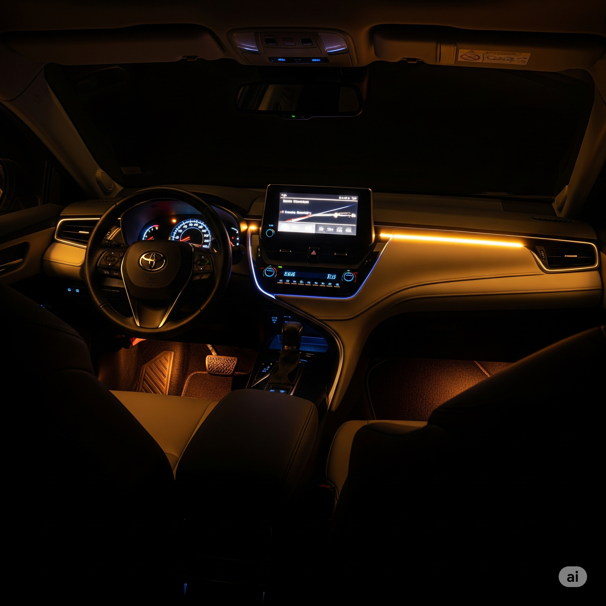 LED strips and fiber optics are installed within your cabin — under seats, inside doors, dashboards, cupholders, and more — all color-adjustable and app-controlled.